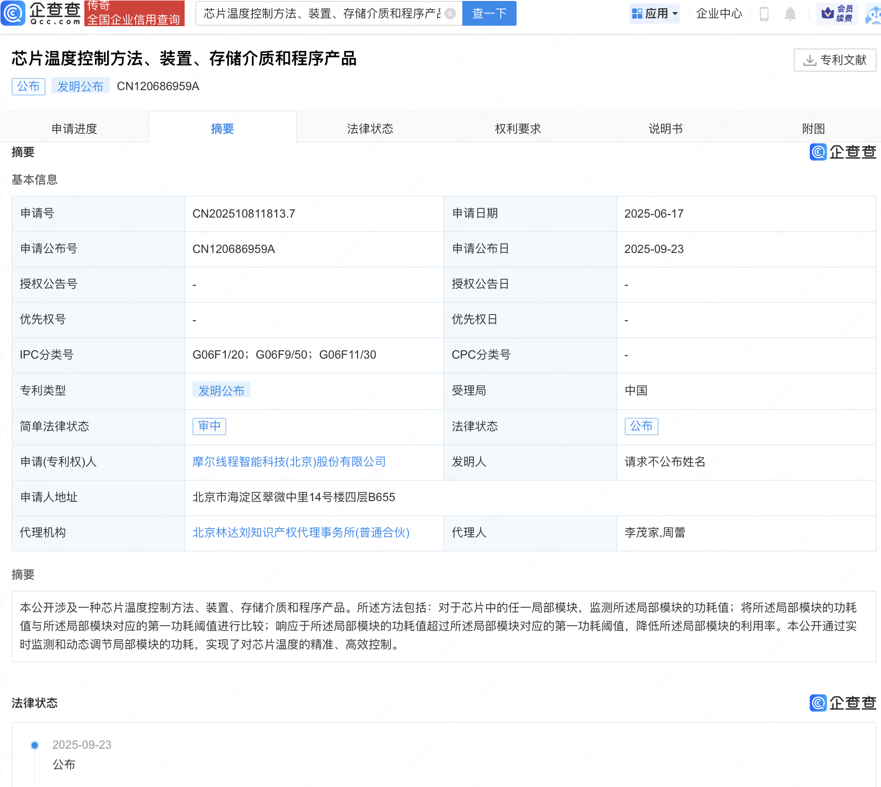近日,摩尔线程智能科技(北京)股份有限公司“芯片温度控制方法、装置、存储介质和程序产品”专利公布。企查查专利摘要显示,所述方法包括:对于芯片中的任一局部模块,监测所述局部模块的功耗值;将所述局部模块的功耗值与所述局部模块对应的第一功耗阈值进行比较;响应于所述局部模块的功耗值超过所述局部模块对应的第一功耗阈值,降低所述局部模块的利用率。本公开通过实时监测和动态调节局部模块的功耗,实现了对芯片温度的精准、高效控制。